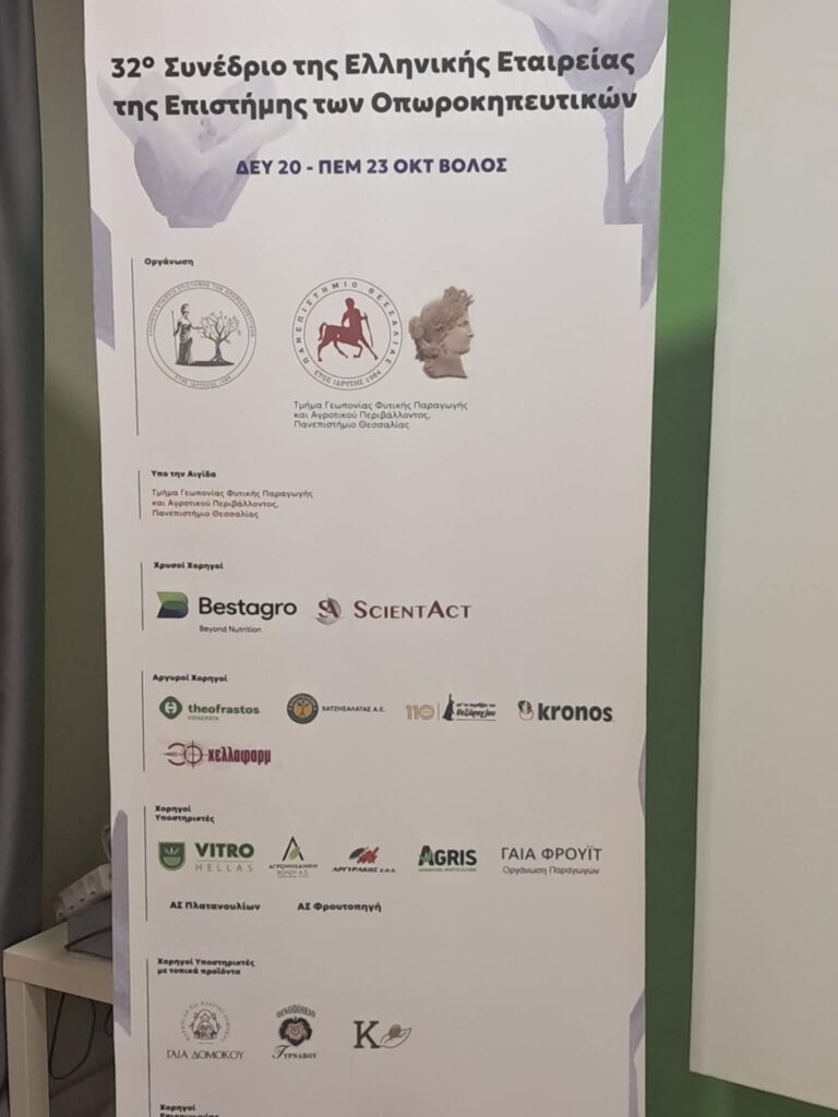 Σημαντική παρουσία είχε ο Αγροτικός Συνεταιρισμός Δένδρων – Ο.Π. Γαία Φρούιτ ως ένας εκ των χορηγών υποστηρικτών αλλά και ως φυσική παρουσία στο 32ο Συνέδριο Ελληνικής Εταιρείας της Επιστήμης των Οπωροκηπευτικών που έγινε σε συνδιοργάνωση με το Τμήμα Γεωπονίας Φυτικής Παραγωγής και Αγροτικού Περιβάλλοντος του Πανεπιστημίου Θεσσαλίας με θέμα : Η επιστήμη των οπωροκηπευτικών ως πυλώνας για τη διατήρηση της αειφορίας και την προσαρμογή των συστημάτων αγροτικής παραγωγής στις νέες περιβαλλοντικές και κλιματικές πιέσεις. Τον συνεταιρισμό εκπροσώπησε ο Προέδρος κ. Xristos Tasioulas Χρήστος Τασιούλας αναφέροντας και συζητώντας στην επιστημονική κοινότητα τα προβλήματα που επικρατούν στην καλλιέργεια της Αχλαδιάς, Ροδακινιάς και Βερικοκιάς με σκοπό την επίλυση των προβλημάτων ή την δημιουργία νέων μεθόδων, νεών ποικιλιών ανθεκτικών στα προβλημάτα που υπάρχουν και προσαρμοσμένων στην κλιματική αλλαγή. Επίσης παρευρέθηκε στο συνέδριο συζητώντας με την επιστημονική ομάδα και ο Πρόεδρος του Οινοποιητικού Συνεταιρισμού Τυρνάβου κ. Χρήστος Τσιτσιρίγγος μιλώντας για τα προβλήματα της αμπελοκαλλιέργειας στην περιοχή του Τυρνάβου. Στο συνέδριο συμμετείχαν καθηγητές από το Πανεπιστήμιο Αθηνών, Πανεπιστήμιο Θεσσαλονίκης, το Ινστιτούτο Γενετικής Βελτίωσης και Φυτογενετικών Πόρων – Τμήμα Φυλλοβόλων Οπωροφόρων Δένδρων Νάουσας καθώς και φοιτητές των Πανεπιστημίων. Ευχαριστούμε πολύ το το Τμήμα Γεωπονίας Φυτικής Παραγωγής και Αγροτικού Περιβάλλοντος του Πανεπιστημίου Θεσσαλίας καθώς και τον κ. Γέωργιο Νάνο καθηγητή στο Τμήμα Γεωπονίας Φυτικής Παραγωγής και Αγροτικού Περιβάλλοντος του Πανεπιστημίου Θεσσαλίας.